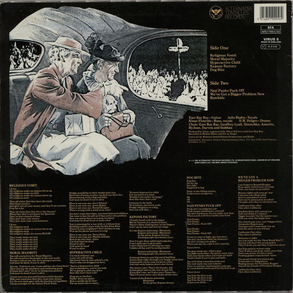 DEAD KENNEDYS In God We Trust, Inc (1981 UK Alternative Tentacles 8-track 12" vinyl EP, showcasing the band's hardcore punk roots but also their trademark humour, with a lounge jazz remake of California Über Alles called We've Got a Bigger Problem Now, housed in a picture sleeve with lyrics on reverse plus company insert. The sleeve shows some corner and edgewear, whilst the vinyl remains in Excellent condition with the odd cosmetic scuff and light signs of play VIRUS5)