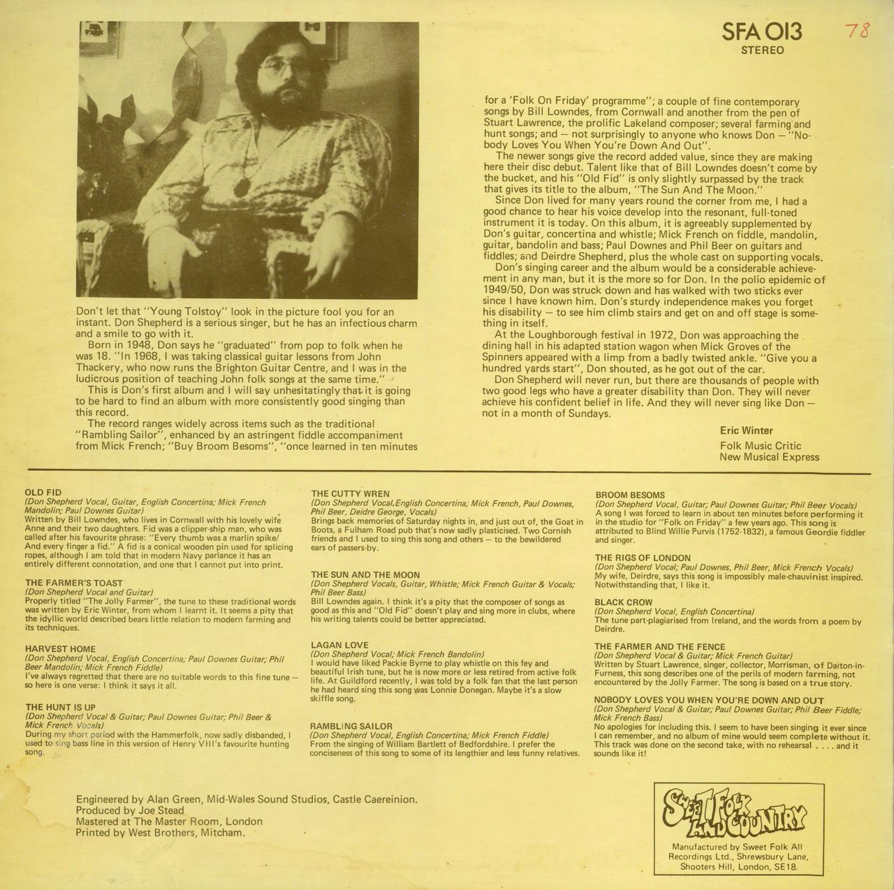 DON SHEPHERD The Sun & The Moon (1975 UK 13-track LP, picture sleeve. The sleeve has been clearly Autographed 'Many Thanks Don Shepherd' on the front. The sleeve shows some creasing and storage wear while the vinyl grades EX/EX- with just some faint scuffs to show play SFA013)
