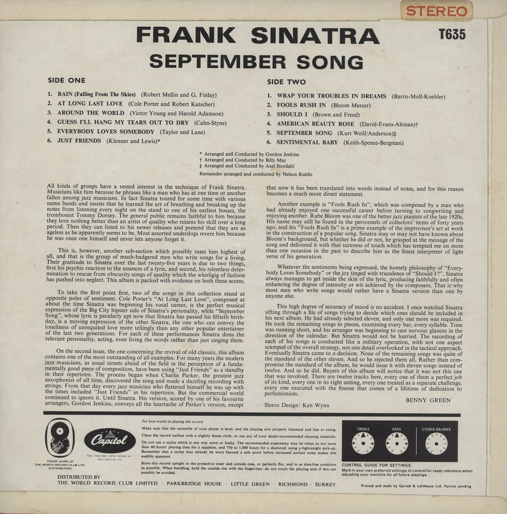 FRANK SINATRA September Song (1967 UK mail order only 12-track stereo LP issued by World Record Club, 'STEREO' stickered front laminated flipback picture sleeve. The sleeve shows just a little light shelfwear and the vinyl remains in superb condition with few signs of play ST635)