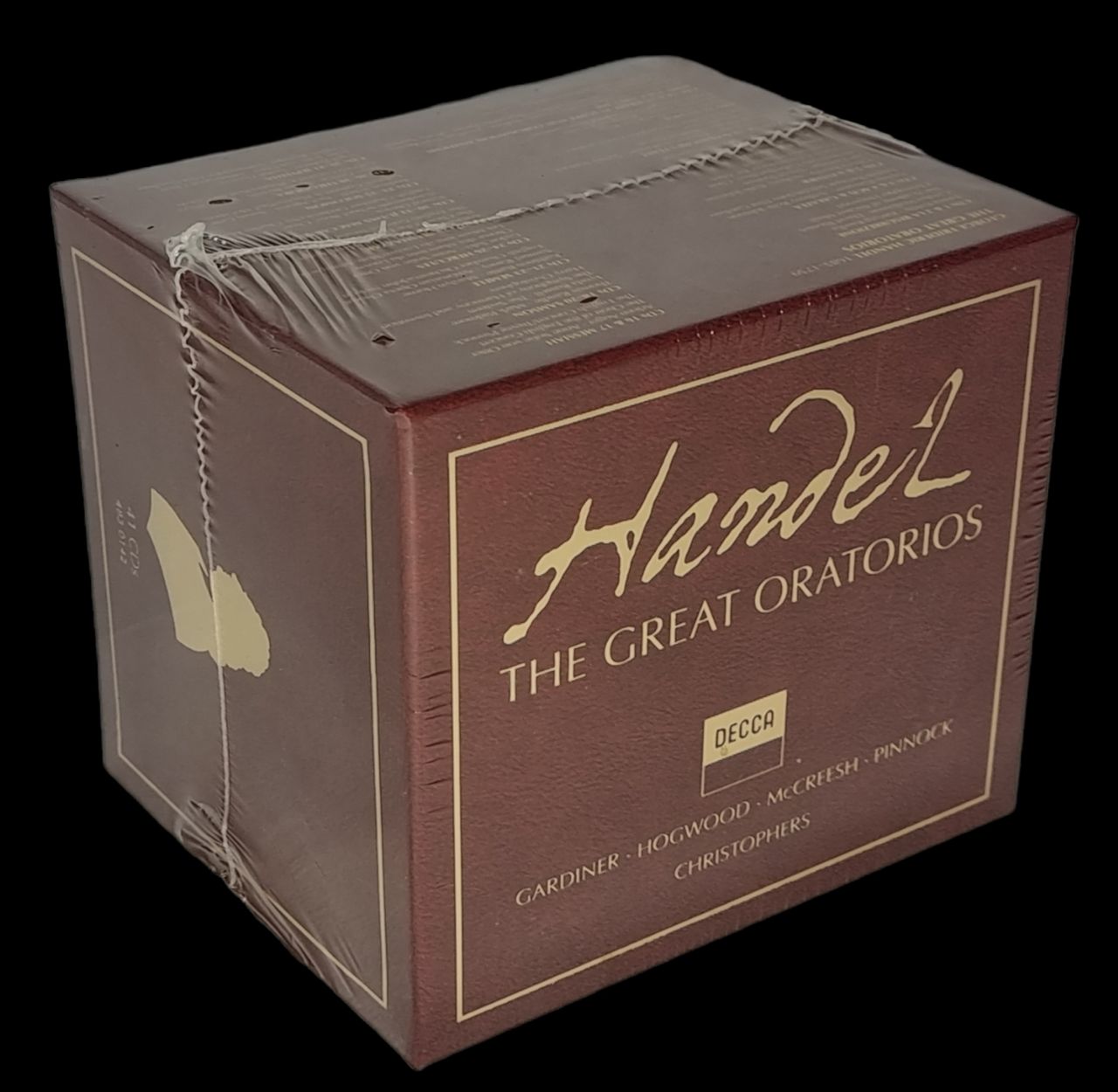 GEORGE FRIDERIC HANDEL The Great Oratorios (2016 Czech FORTY-ONE CD box set featuring such luminaries as Hogwood, Gardiner, Pinnock, Christophers, John Nelson, Minkowski, Mackerras, and McCreesh. Vocal artists include: Carolyn Wilkinson, DavidThomas, Norma Burrowes, Anthony Rolfe Johnson, Ian Partridge, David Thomas, Patrizia Kwella, Joan Sutherland, Emma Kirkby, presented in a flip-top box, includes a booklet with essays, track listing, photographs and credits. The box is in a BRAND NEW condition which remains sealed within its original shrinkwrap)