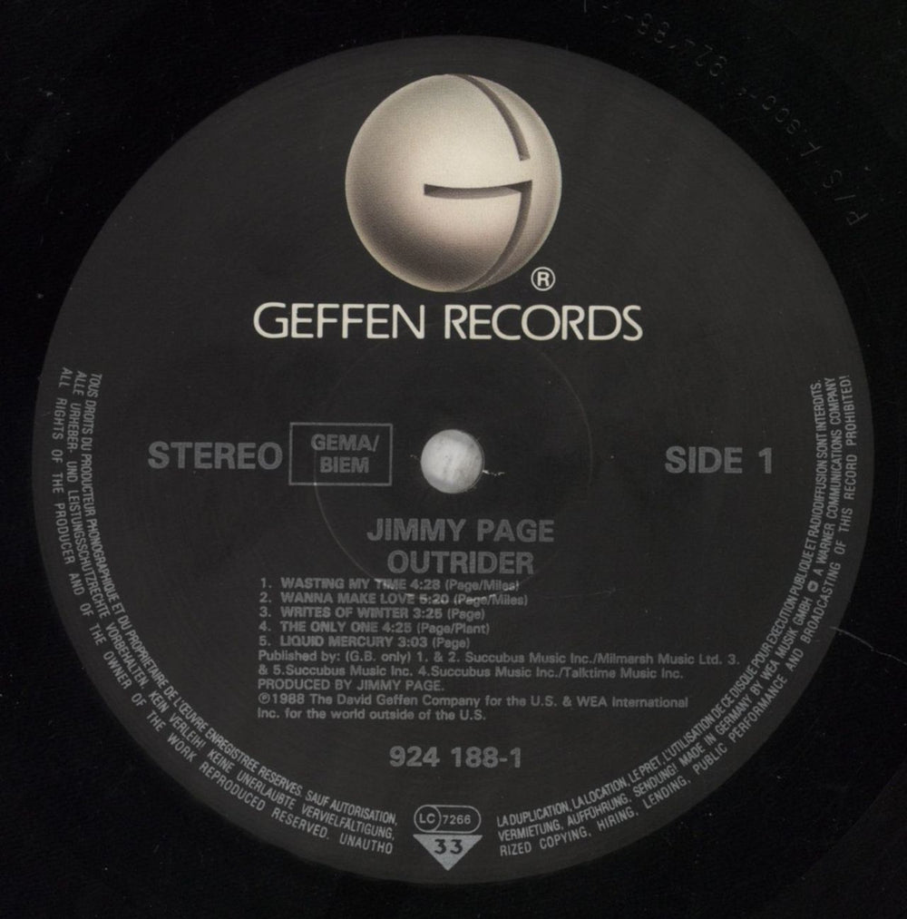 JIMMY PAGE Outrider (1988 UK/German-pressed 9-track LP, glossy picture sleeve with illustrated inner. The sleeve has some light spinewear and a little light storage wear, whilst the vinyl displays little evidence of play and remains in Excellent condition WX155)