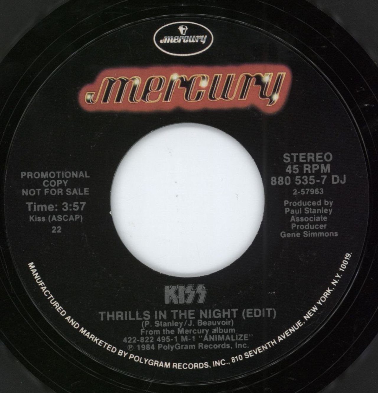 KISS Thrills In The Night (Scarce 1984 US wide centred promotional vinyl 7" for the single release, playing the same 3:57 version on both sides. The vinyl comes issued in the plain die-cut paper sleeve)