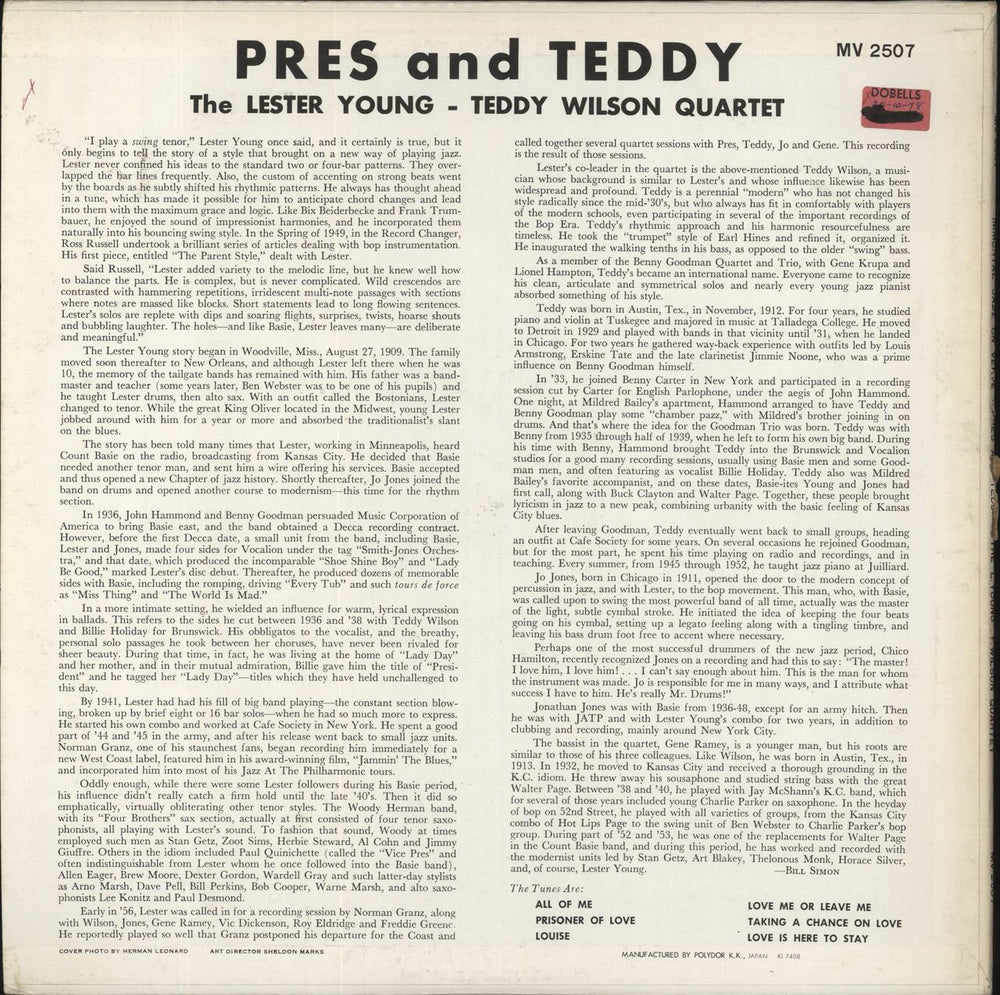 LESTER YOUNG & TEDDY WILSON Pres And Teddy (1974 Japanese issue of the 1956 6-track mono vinyl LP, joined by Gene Ramey and Jo Jones, picture sleeve with extensive sleevenotes and insert. The sleeve shows a little shelfwear (with scuffing tospine, still with Dobell's price sticker on back) whilst the vinyl appears barely played MV2507)