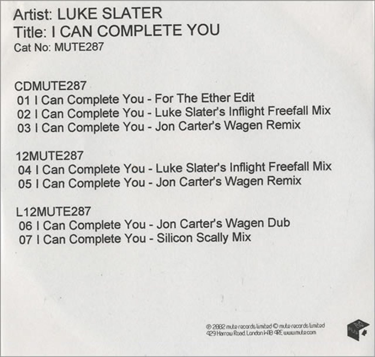 LUKE SLATER I Can Complete You (2002 UK 7-track promotional CD-R acetate featuring 7 mixes of the single taken from his critically acclaimed, refreshingly elaborate album Alright On Top. Includes mixes by Jon Carter, Silicon Scally and Luke himself. Custom printed Mute Records disc with title/tracklisting inlay)