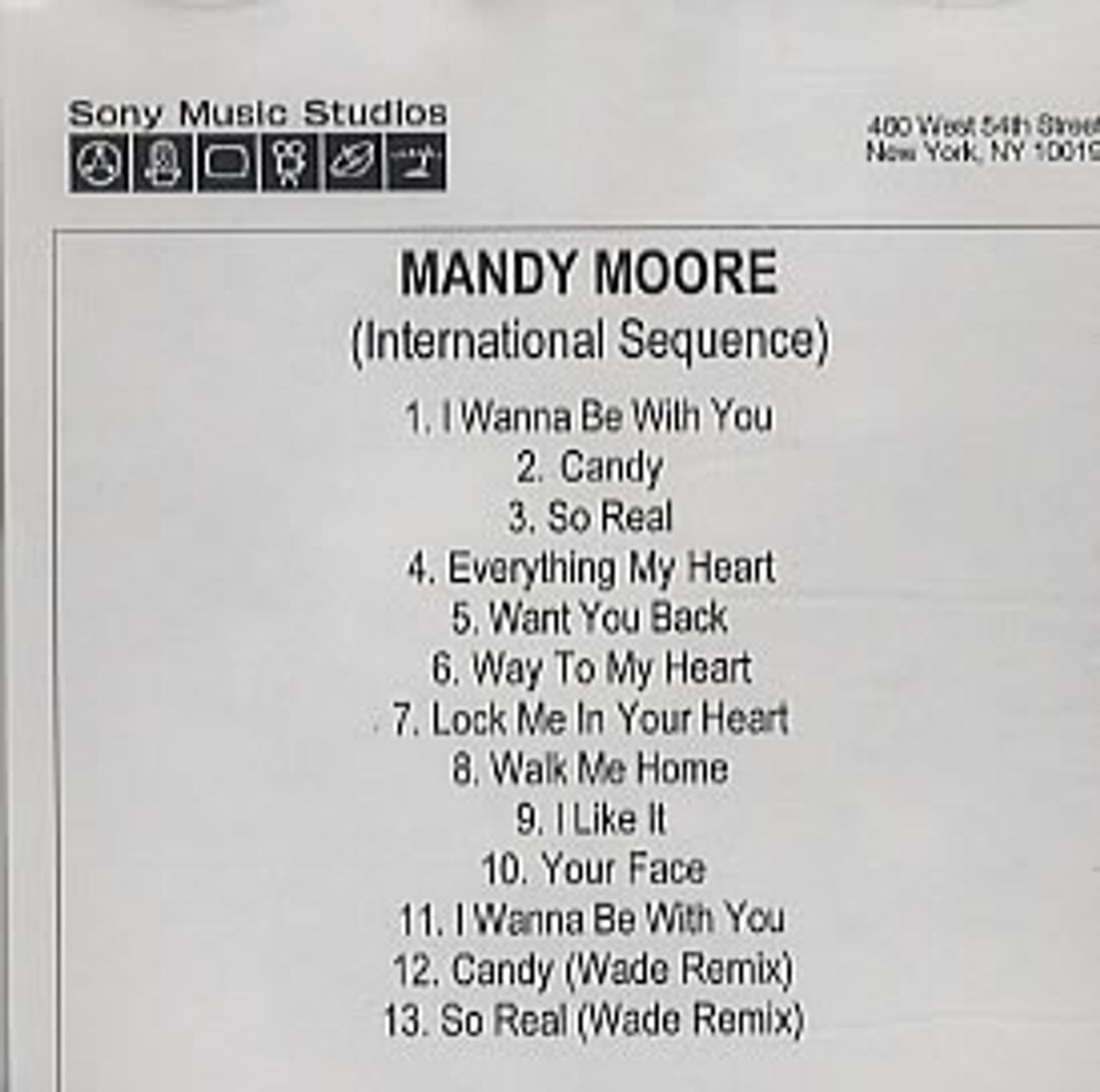 MANDY MOORE (International Sequence) (Rare US 13-track CD-R acetate, issued exclusively to reviewers & radio stations, custom printed disc with tracklisting insert)