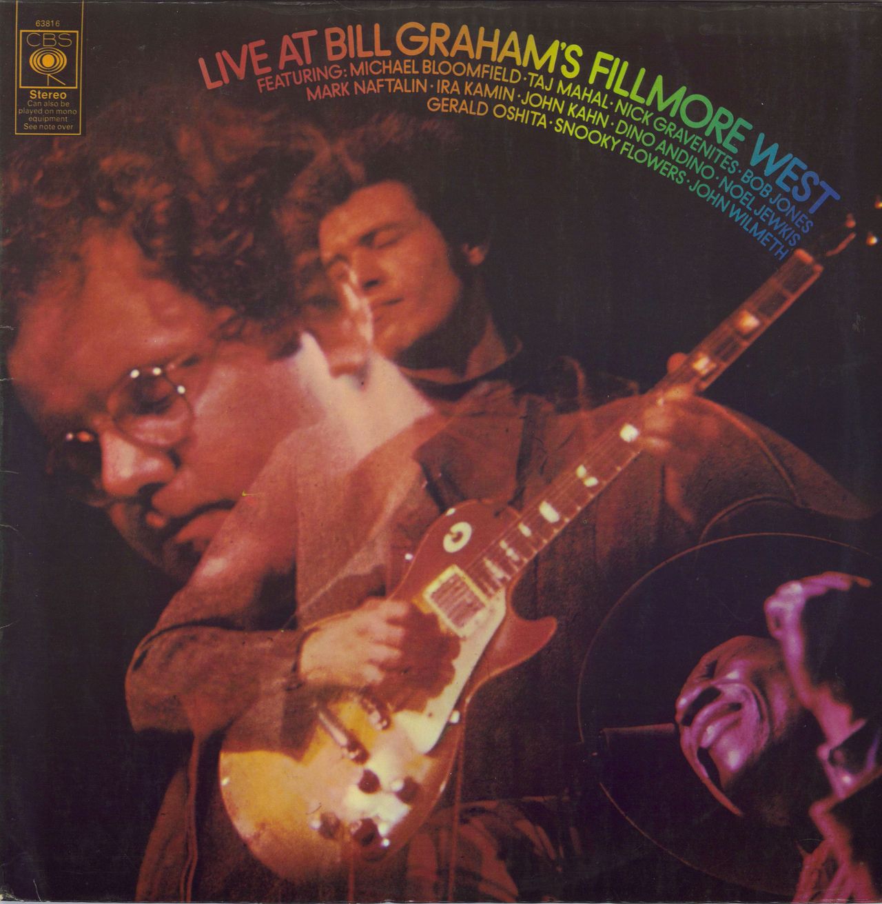 MIKE BLOOMFIELD / VARIOUS Live At Bill Graham's Fillmore West (1969 UK 7-track stereo LP by a 'supergroup', also containing Taj Mahal, Nick Gravenites, Bob Jones, Mark Naftalin, Ira Kamin, Jesse Davis & many more, front laminated picture sleeve. The sleeve shows just a little light shelfwear ans has a small spot of paper loss on the back, however no print is lost as in a plain part of the sleeve, there is also a vintage shop address stamped on the back. The labels remains clean with just a few light spindle marks, whilst the vinyl remains excellent with only light signs of play)