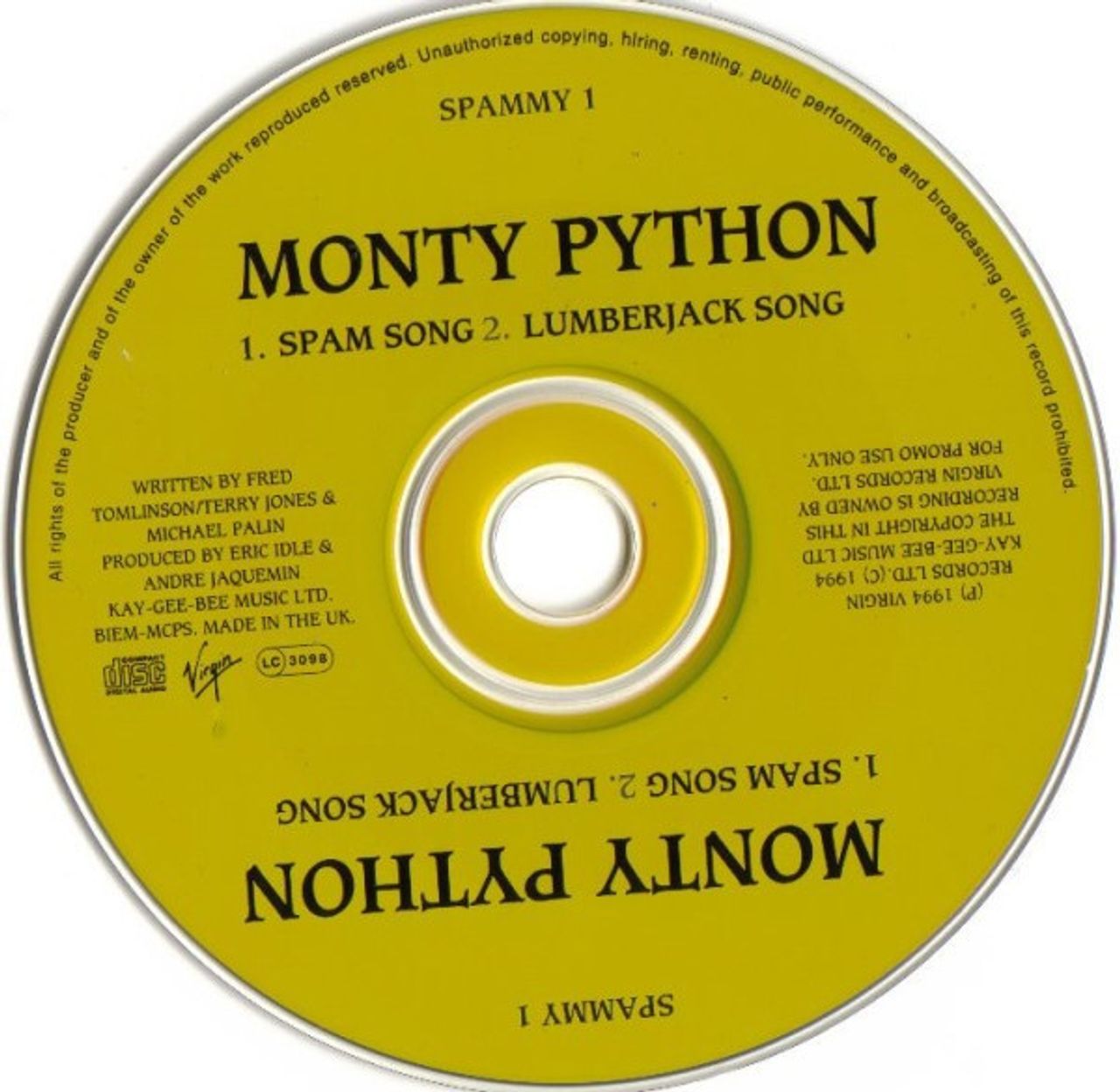 MONTY PYTHON Spam Song (1994 UK 2-track promotional yellow & black printed CD, also including Lumberjack Song, housed in thin jewel case SPAMMY-1)