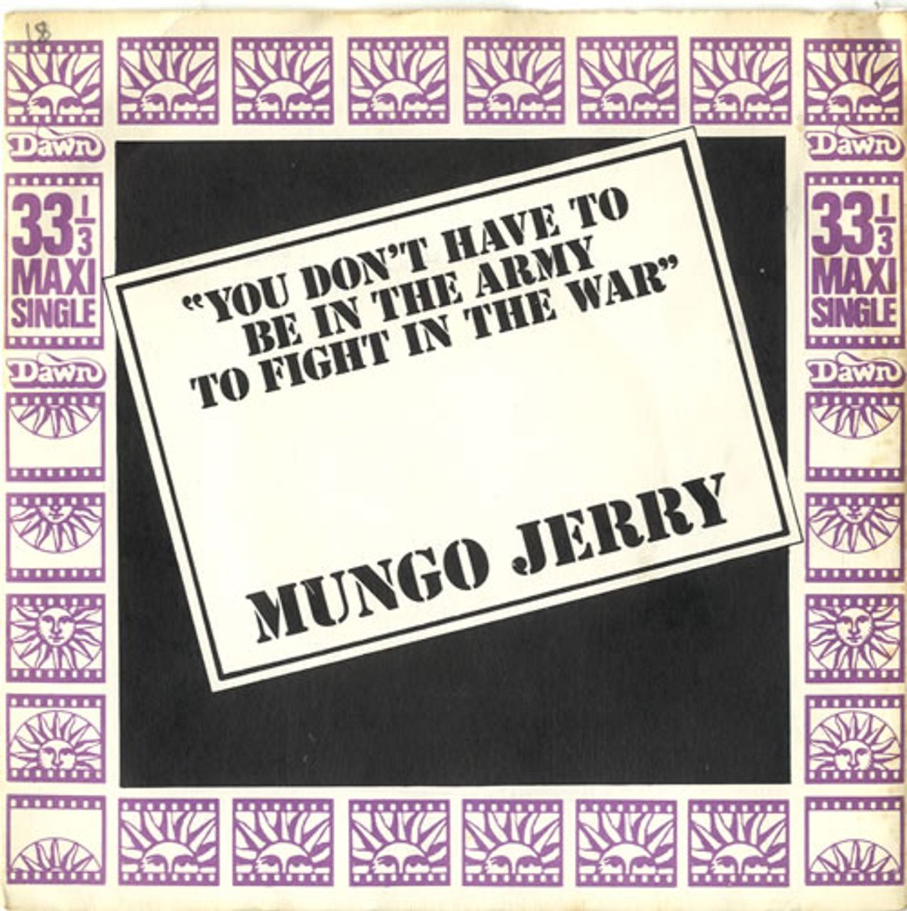 MUNGO JERRY You Don't Have To Be In The Army To Fight In The War EP (1971 UK solid centre 7" vinyl EP playing at 33RPM, also featuring The Sun Is Shining, O'Reilly & We Shall Be Free, picture sleeve with lyrics on the reverse. The sleeve showsjust a little foxing, with the vinyl remaining in excellent condition DNX.2513)