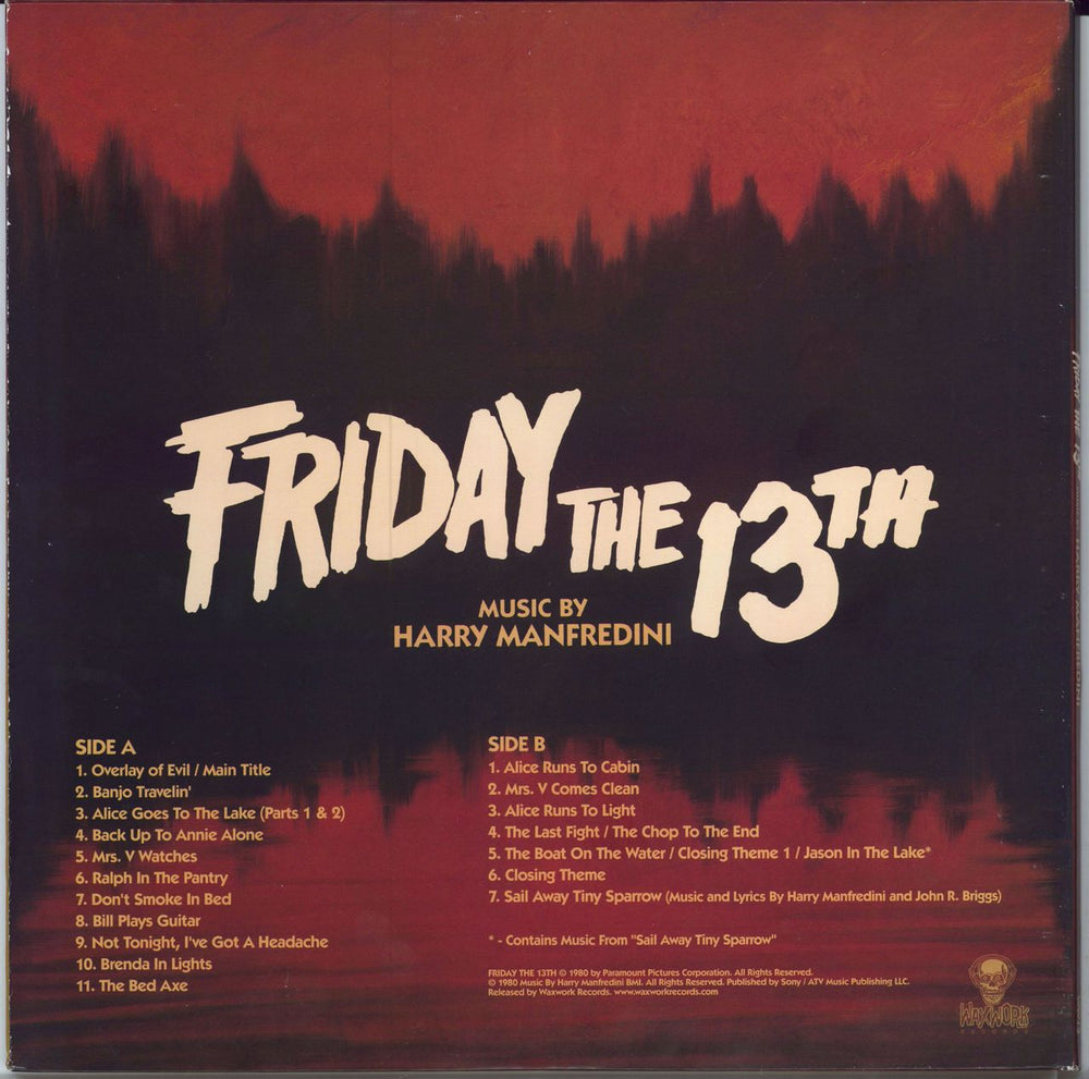 ORIGINAL SOUNDTRACK Friday The 13th (Limited Edition 2014 US 18-track LP, with gatefold picture sleeve and pressed on 180gram 'Crystal Lake Murky Green' with Black Smoke coloured vinyl. Henry Manfedini's excellent score to first installment of the iconic summer camp slasher franchise. Also comes with a 12"x12" art print by Jacqui Oakley. Essential to any horror or soundtrack collection WW13)