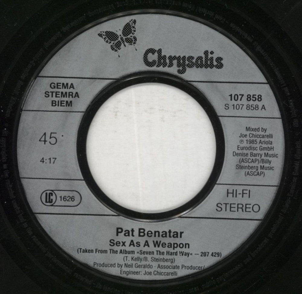 PAT BENATAR Sex As A Weapon (1986 German injection moulded wide centred 7" vinyl single, also including Red Vision, issued in the paper picture sleeve. The sleeve and vinyl remain excellent)