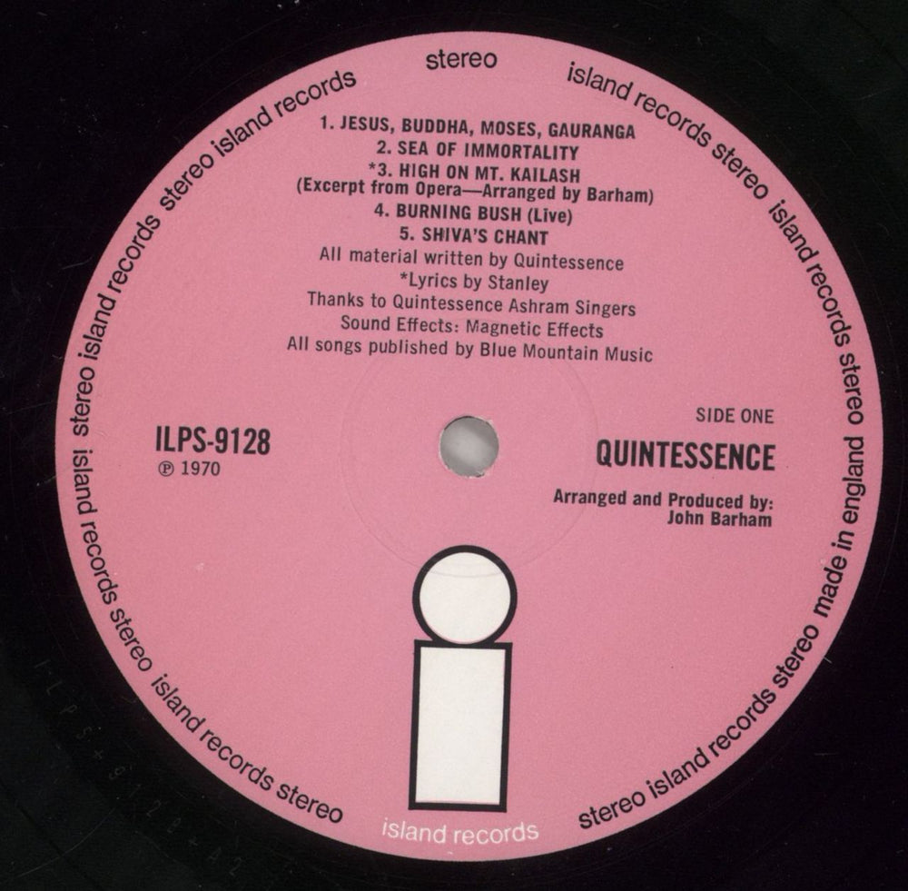 QUINTESSENCE Quintessence (1970 first issue UK pink Island 'i' label LP, peculiar & very colourful fully laminated tri-fold picture sleeve that you need to unfold to remove the record. The sleeve retains a vintage price sticker and shows some wear to the laminate, mainly to the corners and inner folds. The vinyl shows little of its age with few signs of play ILPS9128)