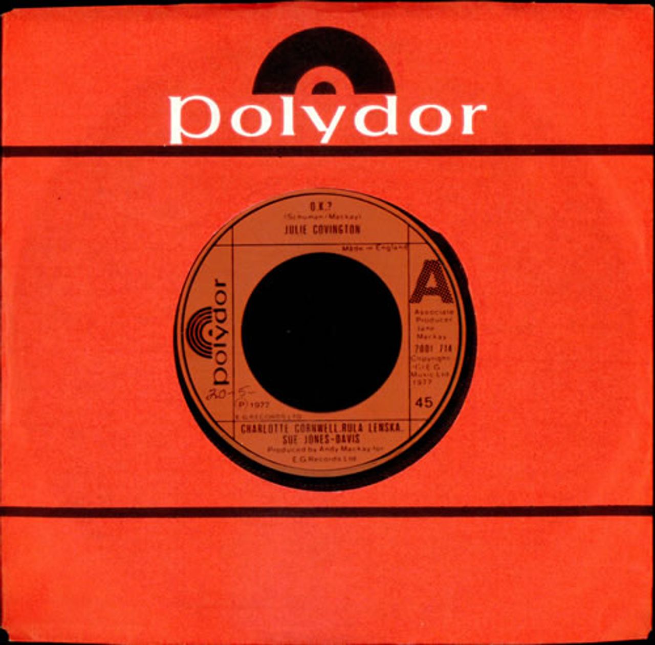 ROCK FOLLIES O.K. ? (1977 UK injection moulded 7" vinyl single, also featuring the Charlotte Cornwell solo vocal 'B-Side', record company die cut paper sleeve)