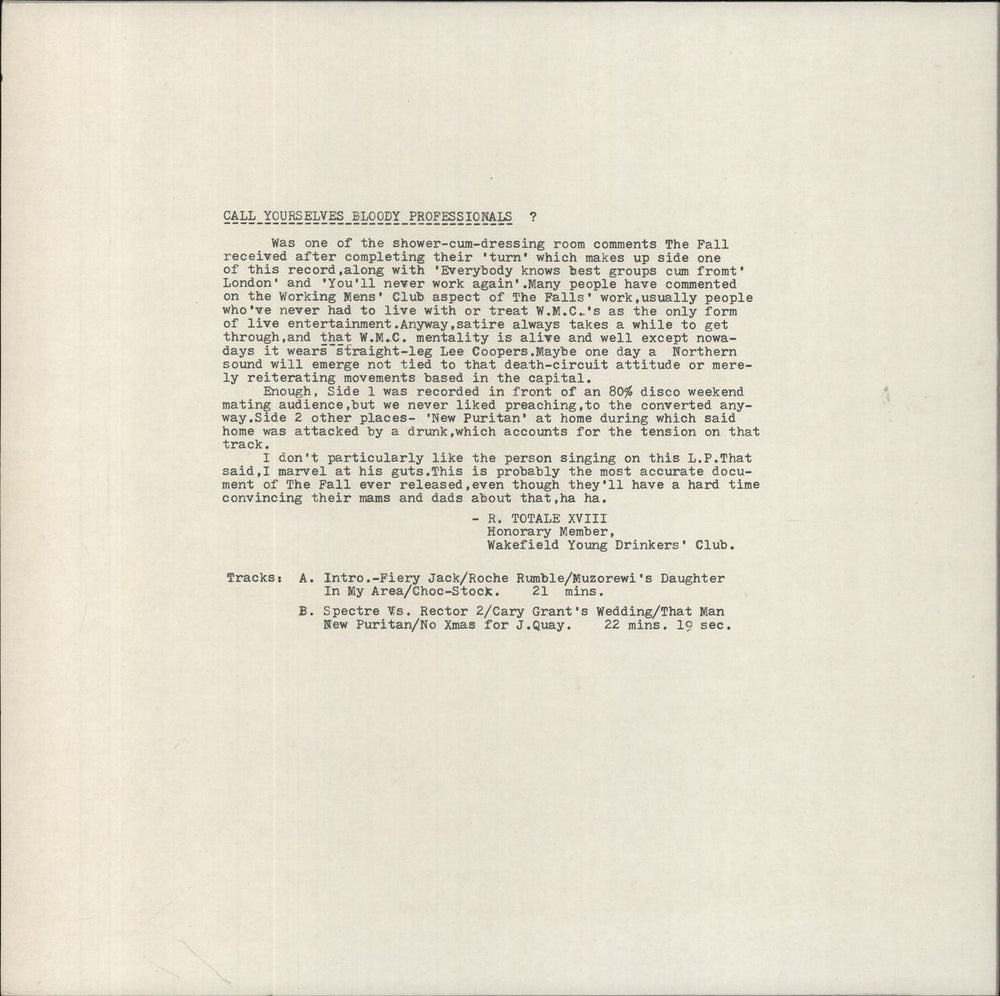 THE FALL Totale's Turns (1980 UK 10-track LP on Rough Trade with 'PORKY PRIME CUT', 'YOU'LL NEVER WORK AGAIN !' & 'R.T. IS DEAD. LONG LIVE R.T.' etchings in the run-offs. Features ten tracks recorded live between October 1979 & February 1980,glossy title sleeve. The sleeve displays minimal wear and the remains Excellent with just a few light cosmetic surface marks and minimal signs of play ROUGH10)