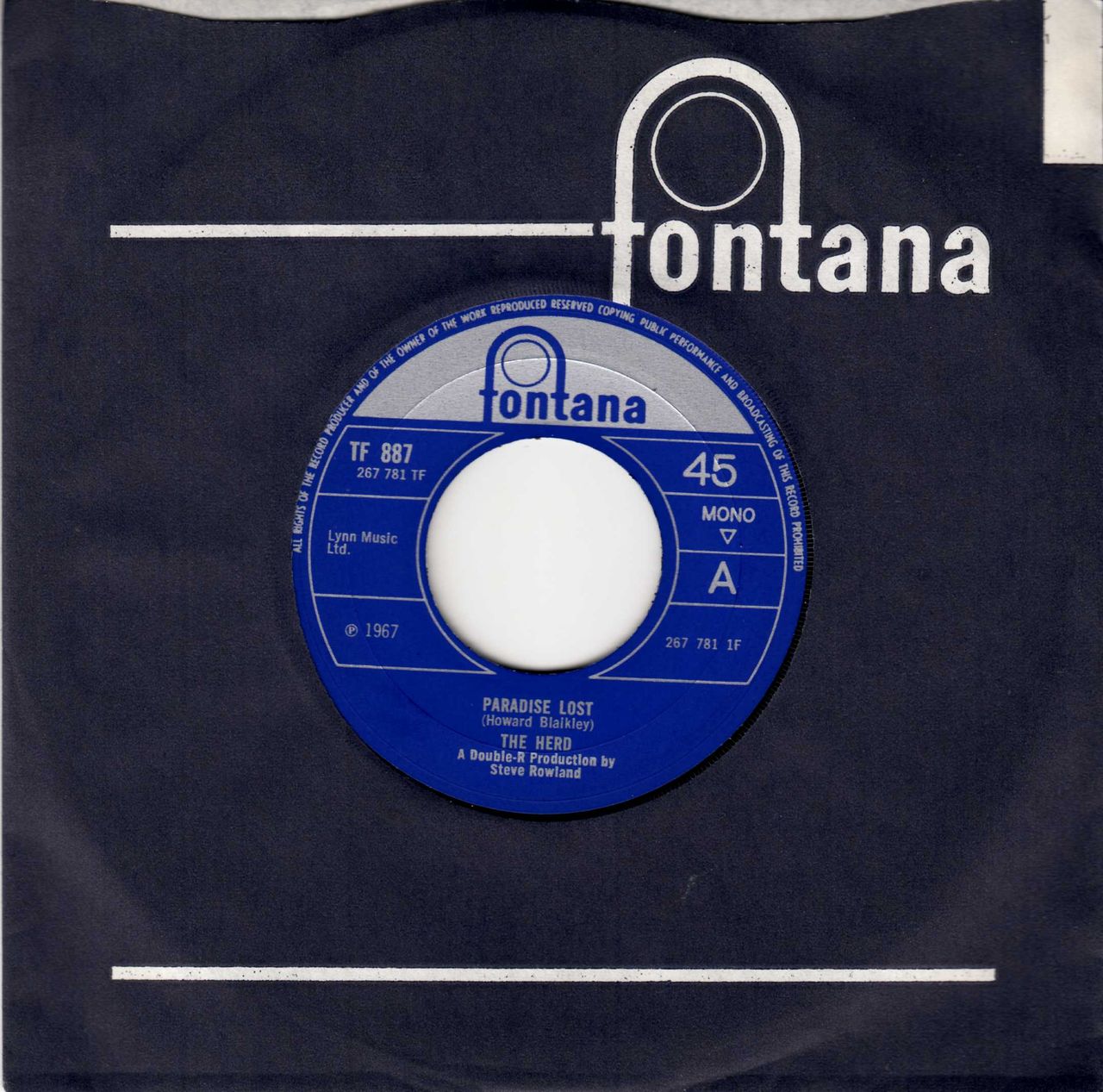 THE HERD Paradise Lost (1968 UK wide centred Mono 7" vinyl single, also including Come On - Believe Me, housed in a Fontana company die cut paper sleeve. This copy remains in a fantastic condition, the company sleeve shows little age and the vinyl looks barely played TF887)