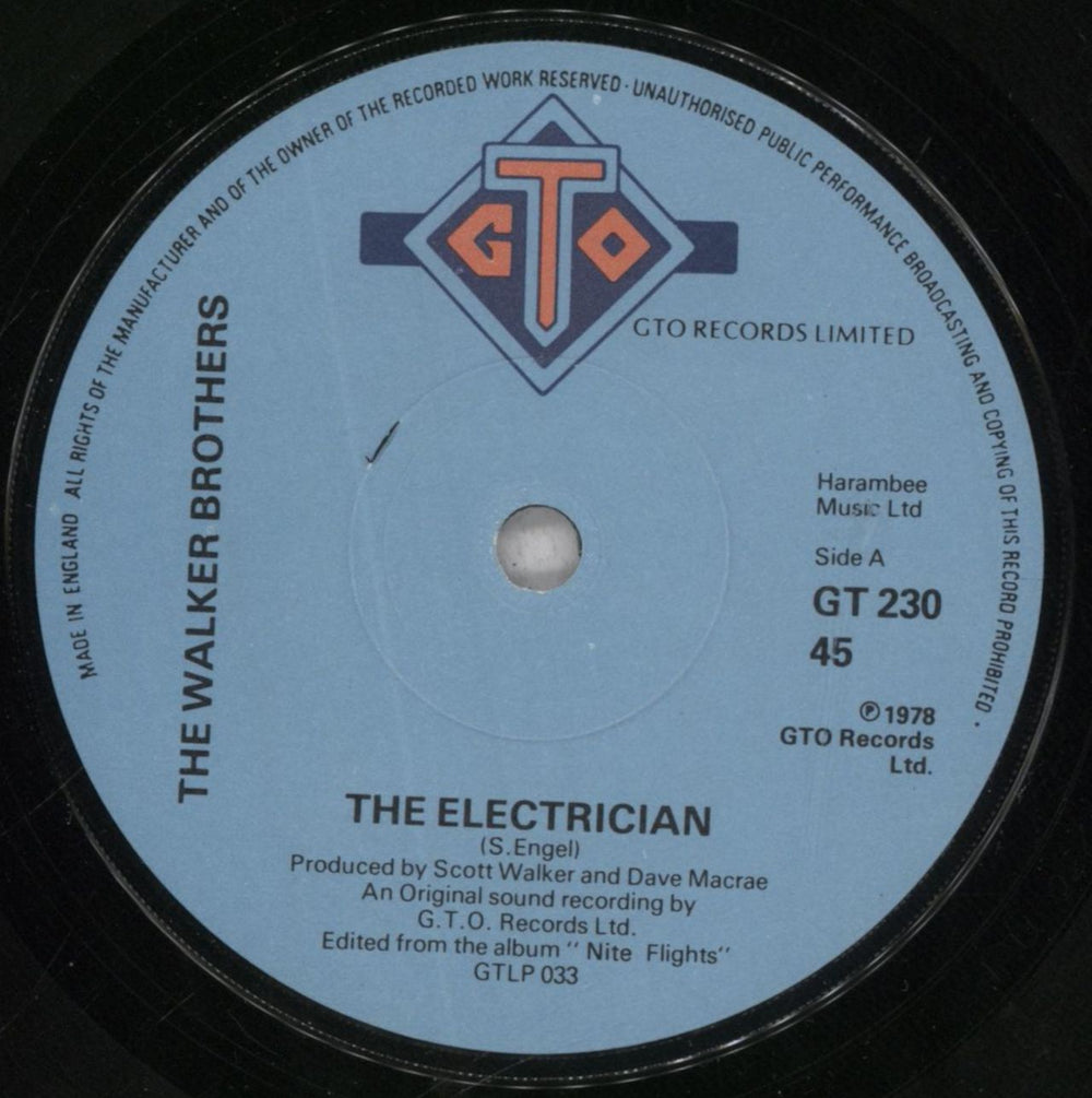 THE WALKER BROTHERS The Electrician (1978 UK 7" vinyl single taken from the cult 'Nite Flights' LP, picture sleeve. Amazing Scott Walker song written from the perspective of a CIA torturer [it had top 20 smash written all over it!]. Also including Gary Leeds' Bowie-like Den Haague. The sleeve [EX-] shows some notable ringwear and creasing, whilst the vinyl looks barely played - overall an excellent copy GT230)